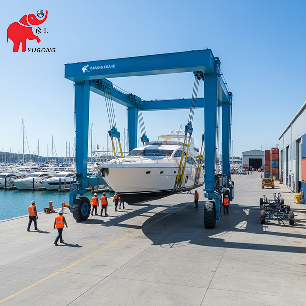 Marine travel lift, also called as yacht crane, is a lifting equipment specially for yacht lifting, shifting and drainage operations. Its structural design requires stability, safety and operational convenience. The overall structure can be divided into three main parts: base support section, boom system and spreader actuator. Each section works together to ensure efficient and safe yacht lifting.