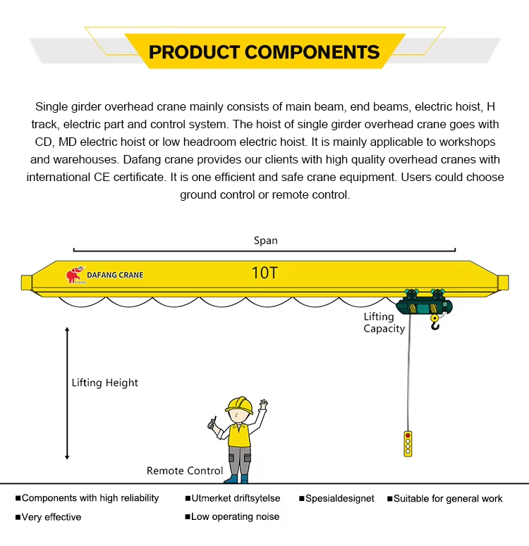 Single girder overhead crane mainly consists of main beam, end beams, electric hoist track, electric part and control system. The hoist of LD single girder overhead crane works with CD, MD electric hoist or low headroom electric hoist. It is mainly applied to manufacturing workshops and warehouses. Dafang crane provides clients with high-quality overhead cranes with international CE/ISO/EAC certificate. Users can choose ground control or remote control.