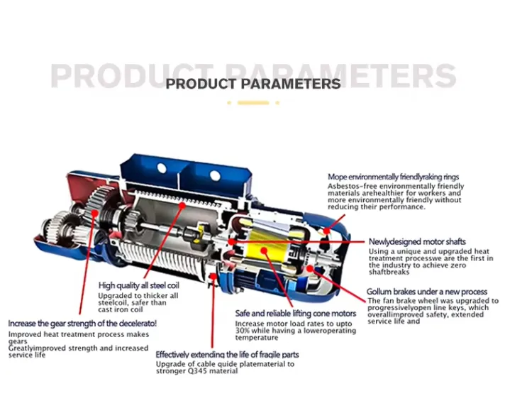 User-friendly configurations boost value. Eccentric frame plates for stable heavy loads; welded drums (with round steel and steel plates) for long service life; trolley side plates with high precision, thickened steel pipe joints; self-developed motors with aluminum casings for heat dissipation, thickened reducer casings (with 100% airtightness testing), ball iron rope guides (wear-resistant), pre-added lubricating oil, gravity steel safety cards (preventing hook disengagement), standard overload limiters, and 100m remote controls all enhance use performance.
